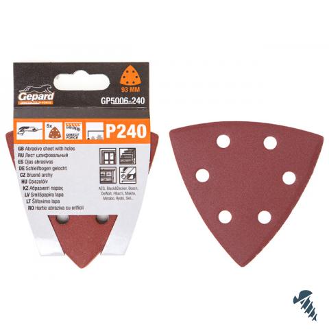 Шлифлист 93мм дельта Р80 д/дерева 6 отв. 5шт. GEPARD (GP5006-80) (лист шлифовальный перфорированный треугольник абразивный)