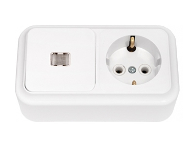 Блок выкл. 1 клав. + розетка (открытая, с/з) со световой индикацией, белая, Пралеска, BYLECTRICA