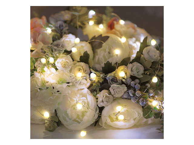 Гирлянда состоит из тонкого провода длиной 2 метра, с расположенными на нем 20 теплыми белыми долговечными светодиодами.