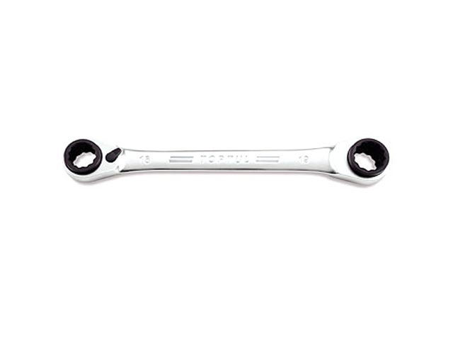 Ключ накидной 4 в 1 TOPTUL имеет двойные окончания, одно из которых подходит для болтов размером 16 и 19 мм, а второе - для болтов размером 17 и 18 мм. Ключ может применяться как трещотка. Механизм храповика имеет переключатель и способен работать как на зажим, так и на отворот.