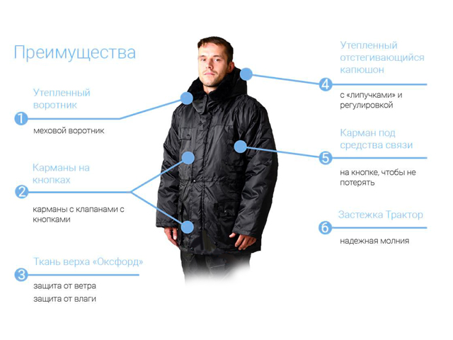 Куртка удлиненная на молнии "Трактор" и ветрозащитным клапаном на кнопках. Кулиса на поясе с регулировочной веревкой. Воротник меховой. Отстегивающийся капюшон с регулировкой и контактной лентой для защиты от ветра. Два нагрудных кармана с клапанами и кнопками. Один из карманов для средств связи. Два накладных кармана снизу с клапанами кнопками.