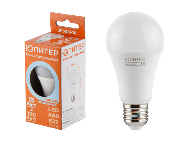Лампа светодиодная A60 СТАНДАРТ 15 Вт 170-240В E27 4000К ЮПИТЕР (100 Вт аналог лампы накал., 1200Лм, нейтральный белый свет)