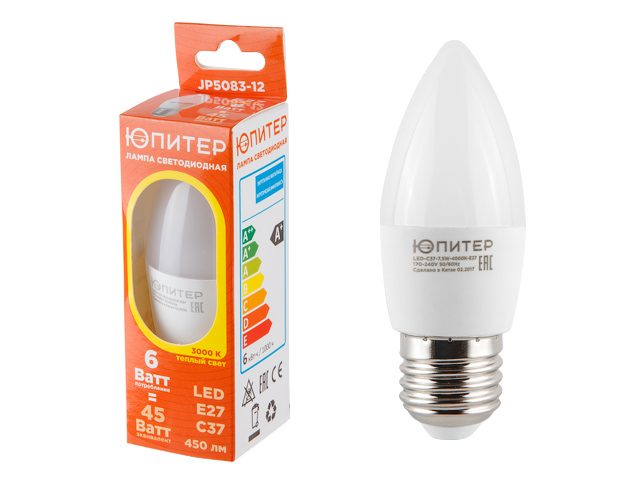 Лампа светодиодная C37 СВЕЧА 6 Вт 170-240В E27 3000К ЮПИТЕР (45 Вт аналог лампы накал., 450Лм, теплый белый свет)