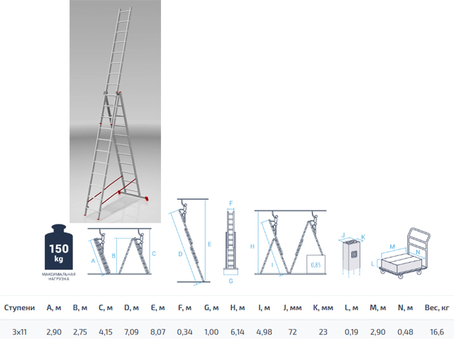 Высота лестницы - 709см, высота стремянки - 275см, высота секции - 290см.