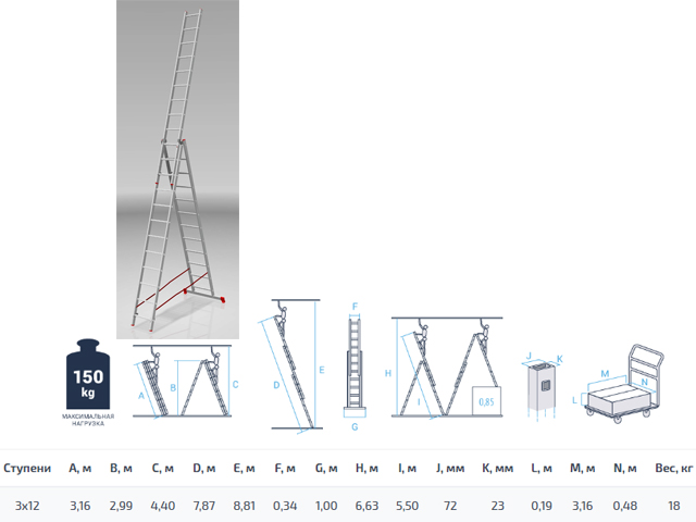 Высота лестницы - 787см, высота стремянки - 299см, высота секции - 316см.