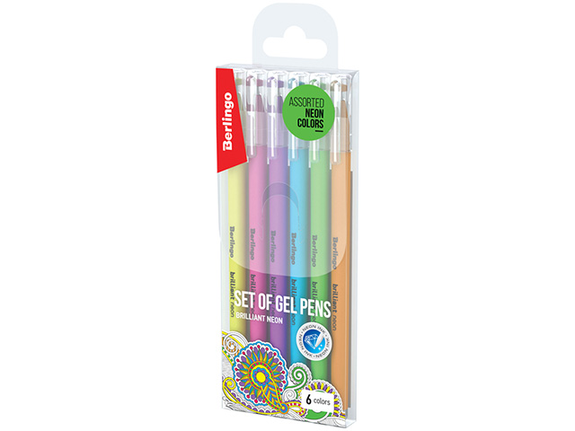 Набор гелевых ручек BERLINGO Brilliant Neon из 6 неоновых цветов с флуоресцентным эффектом: жёлтый, зелёный, оранжевый, розовый, голубой, фиолетовый. Утончённый корпус с бархатистым покрытием soft-touch, прозрачный колпачок с клипом. Цвет корпуса соответствует цвету чернил. Корейские водо- и светостойкие чернила. Оптимальный диаметр пишущего узла - 0,8 мм - для мягкости письма и насыщенности цвета. Удобная и привлекательная упаковка - пластиковый пенал с европодвесом.