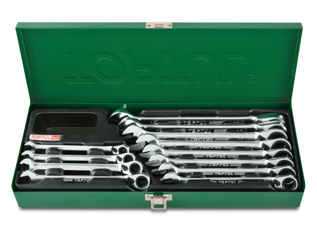 Профессиональный набор из 12 комбинированных ключей с переключаемой трещоткой TOPTUL PRO SERIES GAAD1205 в металлическом кейсе.