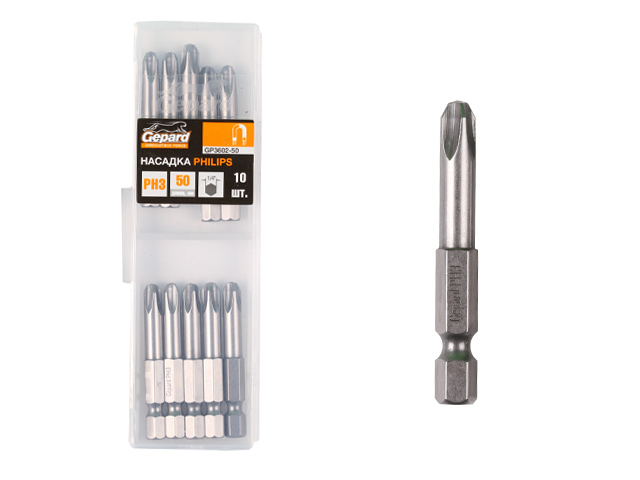 Насадка крестообразная PH2 50мм 10шт GEPARD (GP3601-50) (бита Phillips сталь S2 магнитная)