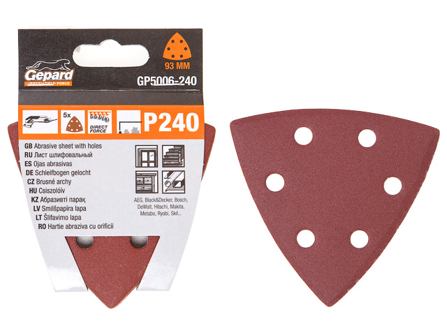 Шлифлист 93мм дельта Р80 д/дерева 6 отв. 5шт. GEPARD (GP5006-80) (лист шлифовальный перфорированный треугольник абразивный)