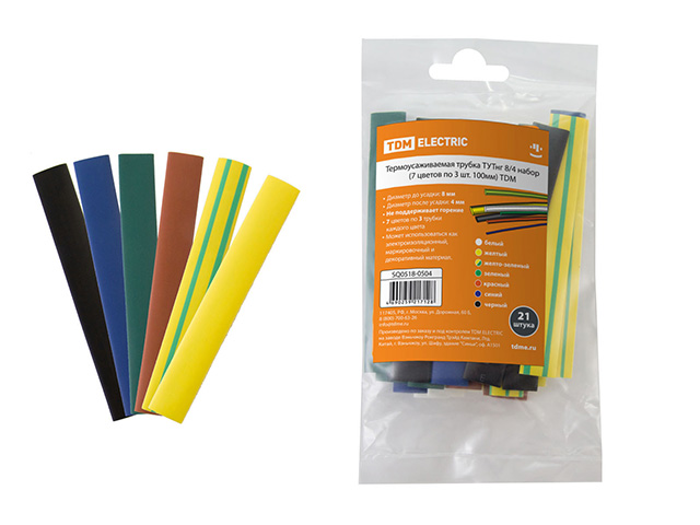 Термоусаживаемая трубка ТУТнг 8/4 набор (7 цветов по 3 шт. 100мм) TDM