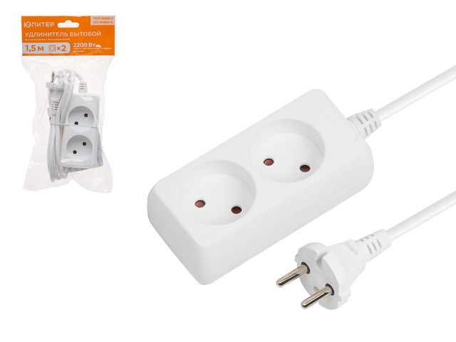 Удлинитель 1,5м (2 роз., 2,2кВт, б/з, ПВС 2х0,75) Юпитер (ЮПИТЕР)
